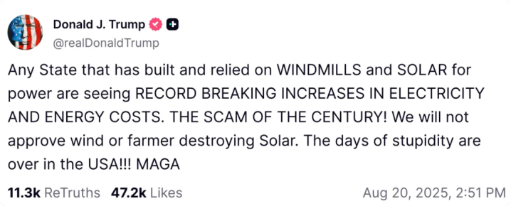 特朗普上周二向可再生能源宣战,其在“真相社交”发帖称: “任何建造并依赖风电和太阳能发电的州,电力和能源成本都出现了创纪录的增长。这是本世纪最大的骗局!我们不会批准风能或破坏农业的太阳能。美国的愚蠢时代已经结束了!!!MAGA!”